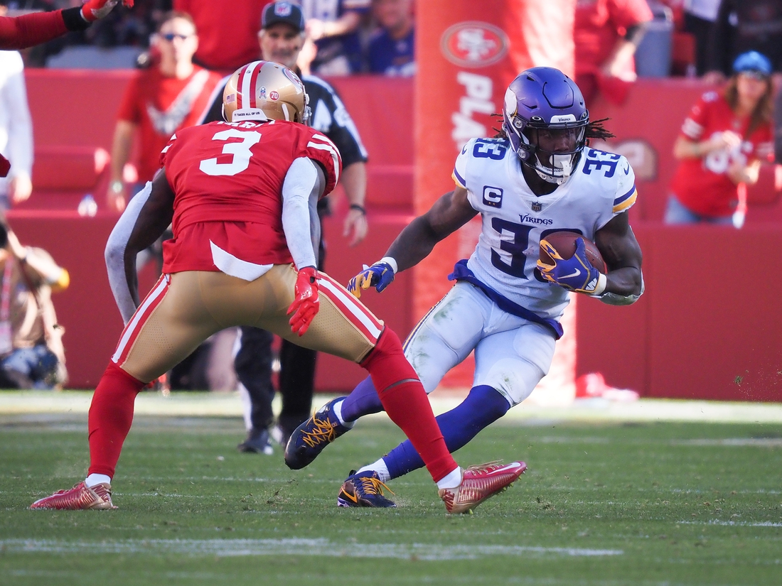 Minnesota Vikings running back Dalvin Cook was carted off the field with a shoulder injury late in the third quarter of Sunday’s game against the San Francisco 49ers.