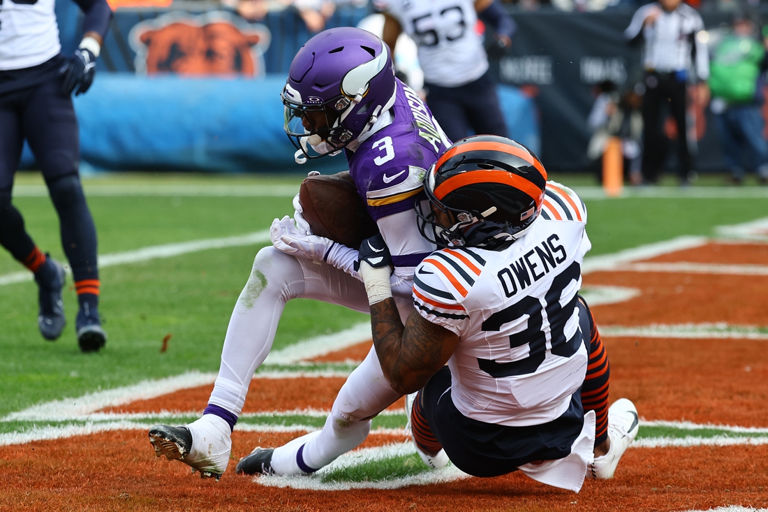 The Bears recovered an onside kick on the next play to regain possession at their 43-yard line with 21 seconds left. Cairo Santos’ kick bounced off the foot of Vikings tight end Johnny Mundt, and Tarvarius Moore recovered it.