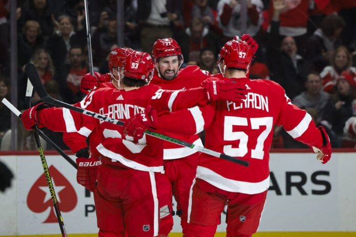 The game was tied 1-1 after the first period, but Detroit blew the game open by scoring four goals over a 10-minute span of the second period to take a 5-1 lead.