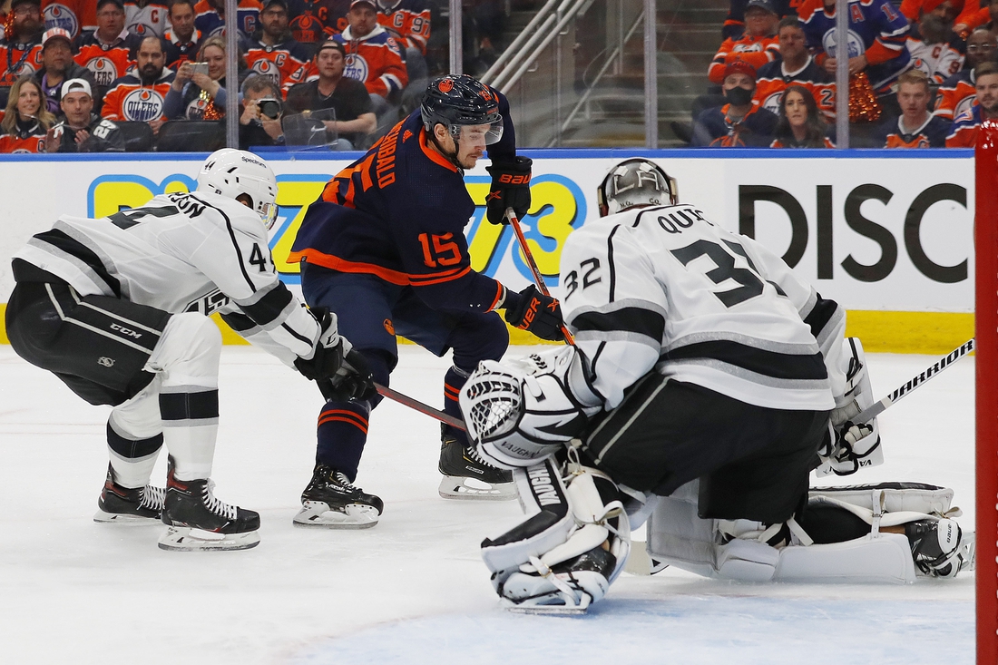 Edmonton cut it to 3-2 early in the third period on a power-play goal by McDavid, who scooped up a puck in the left circle and then went in and roofed a backhand shot over Quick for his second goal of the playoffs.