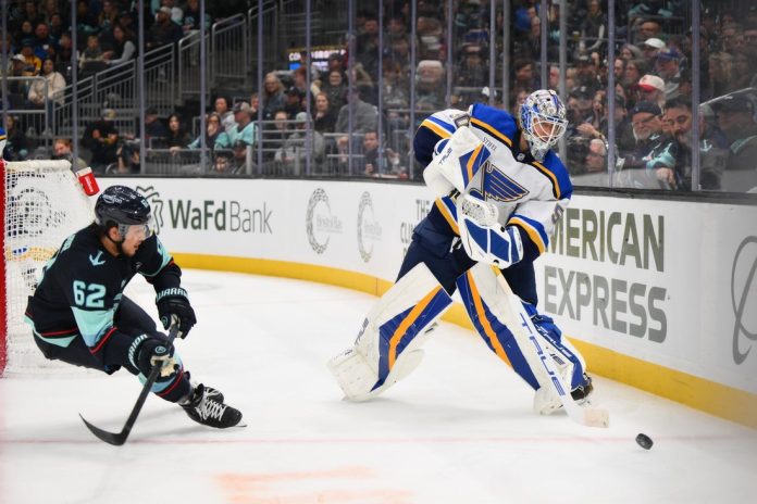 Eyssimont again put the Kraken ahead at 6:44 when he converted off the rush, but the Blues responded right away with a pair of goals 13 seconds apart.