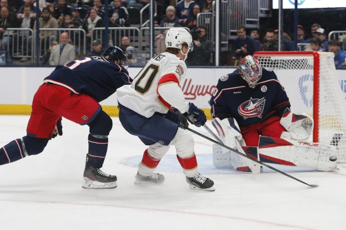 Columbus’ Adam Fantilli nearly scored early into the third period after his shot caromed off the post. He also provided a stellar defensive play in the first, alertly making a sliding block to deny Florida defenseman Nate Schmidt from point-blank range.