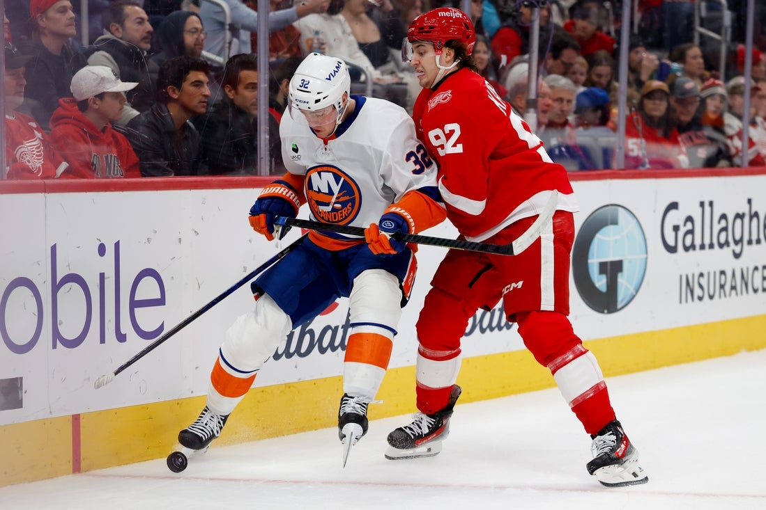 Alex DeBrincat scored two power-play goals, including the game-winner with 2:17 left, to lead the host Detroit Red Wings to a 3-2 come-from-behind win over the New York Islanders on Tuesday night.
