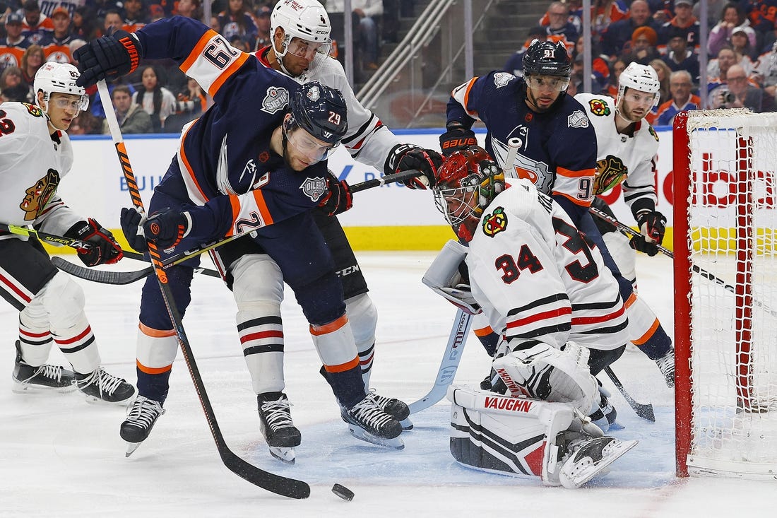 Connor McDavid, Leon Draisaitl and Zach Hyman each collected one goal and two assists and the host Edmonton Oilers scored four goals in the second period on the way to a 7-3 drubbing of the Chicago Blackhawks on Saturday.