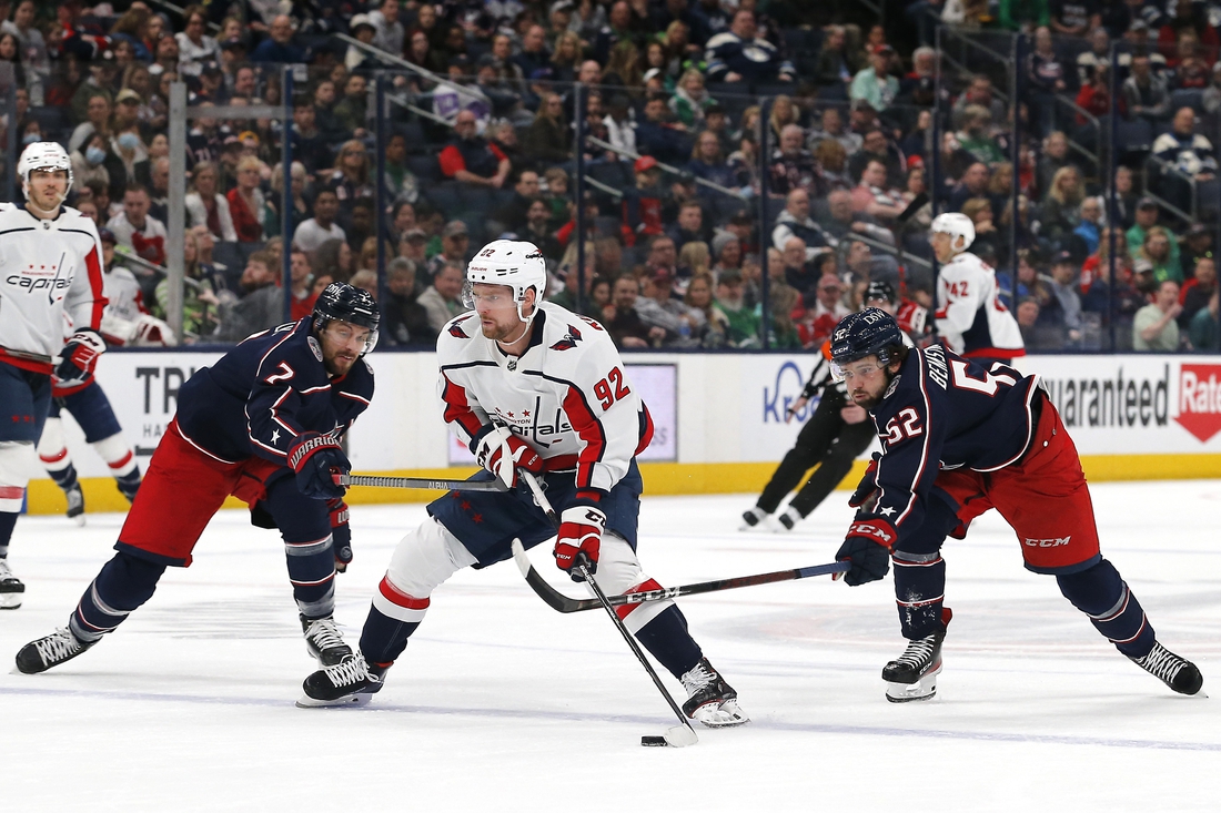 The Capitals took a 1-0 lead at 4:29 of the first period. Columbus turned the puck over in the offensive end and T.J. Oshie passed up ice to Mantha, who slid a backhander between Korpisalo’s pads on a breakaway.