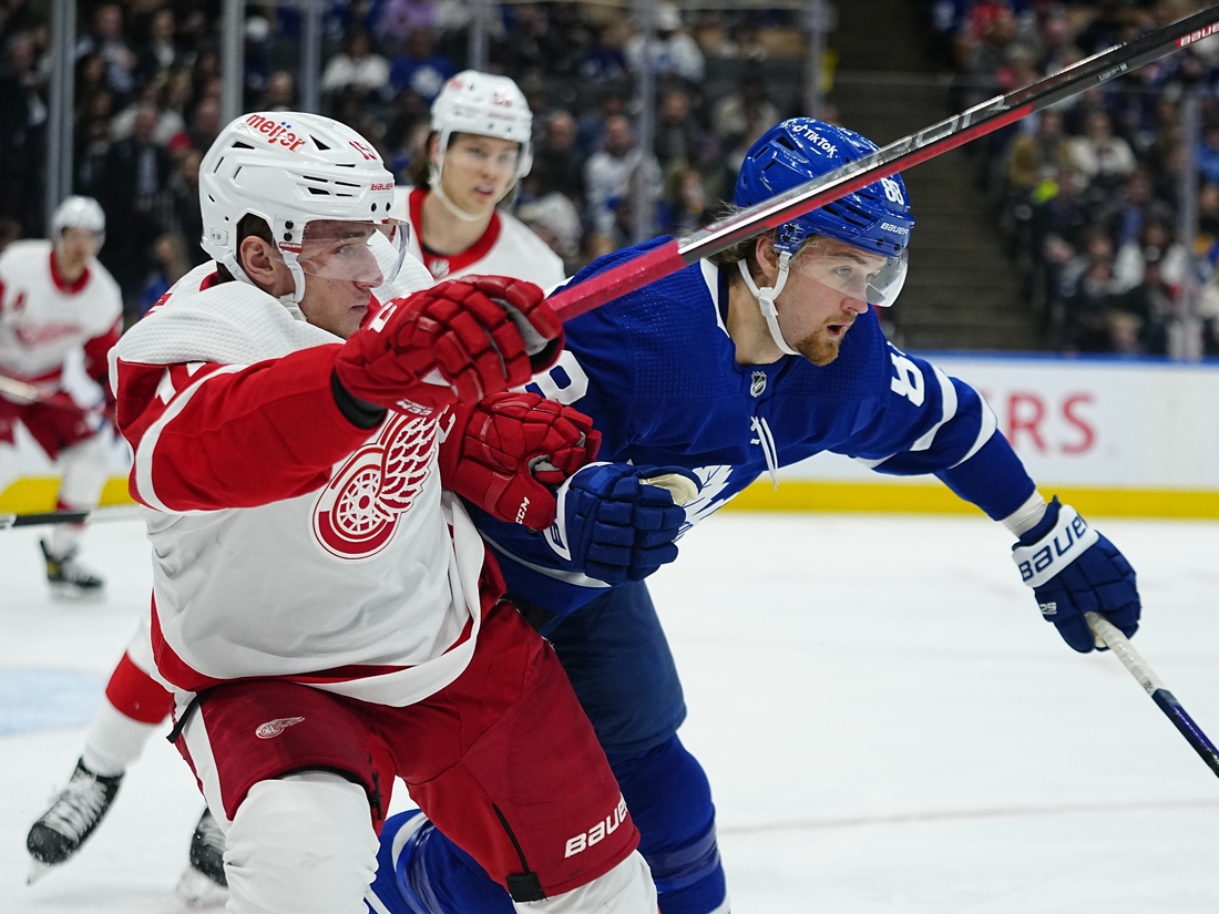 A Red Wings turnover in their own zone led to the first goal at 15:48 of the second period. Colin Blackwell collected the puck behind the Detroit net and passed it to Jason Spezza. He slipped it to Matthews, who made Nedeljkovic sprawl by faking a shot, then flicked it into the net.