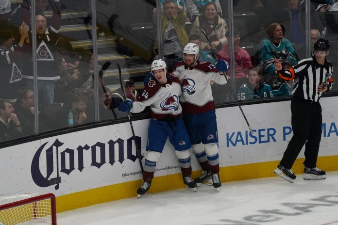 Colorado’s Nathan MacKinnon leads the NHL in both points (52) and assists (39) after setting up a pair of goals against San Jose.