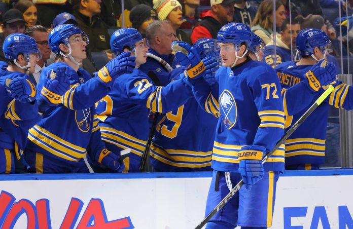 JJ Peterka followed up Thompson’s early outburst with a goal of his own after taking a no-look pass from Zach Benson. Peterka sent a one-timer home just 11 seconds after Thompson’s second goal.