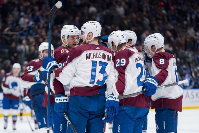 Valeri Nichushkin scored the game-winner 30 seconds into overtime when MacKinnon’s shot from the top of the left circle bounced off the back of Vancouver defenseman Noah Juulsen and then ricocheted off the visor of Nichushkin hunched over in front of the crease and into the net.