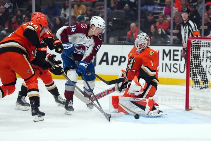Colorado trailed 2-0 after two periods but rallied in the third. Aamodt made it 2-1 when his pass attempt to the front of the net went off the skate of the Ducks’ Pavel Mintyukov and in at 10:05, and Drury tipped Sam Malinski’s shot from the point for a power-play goal at 14:34.