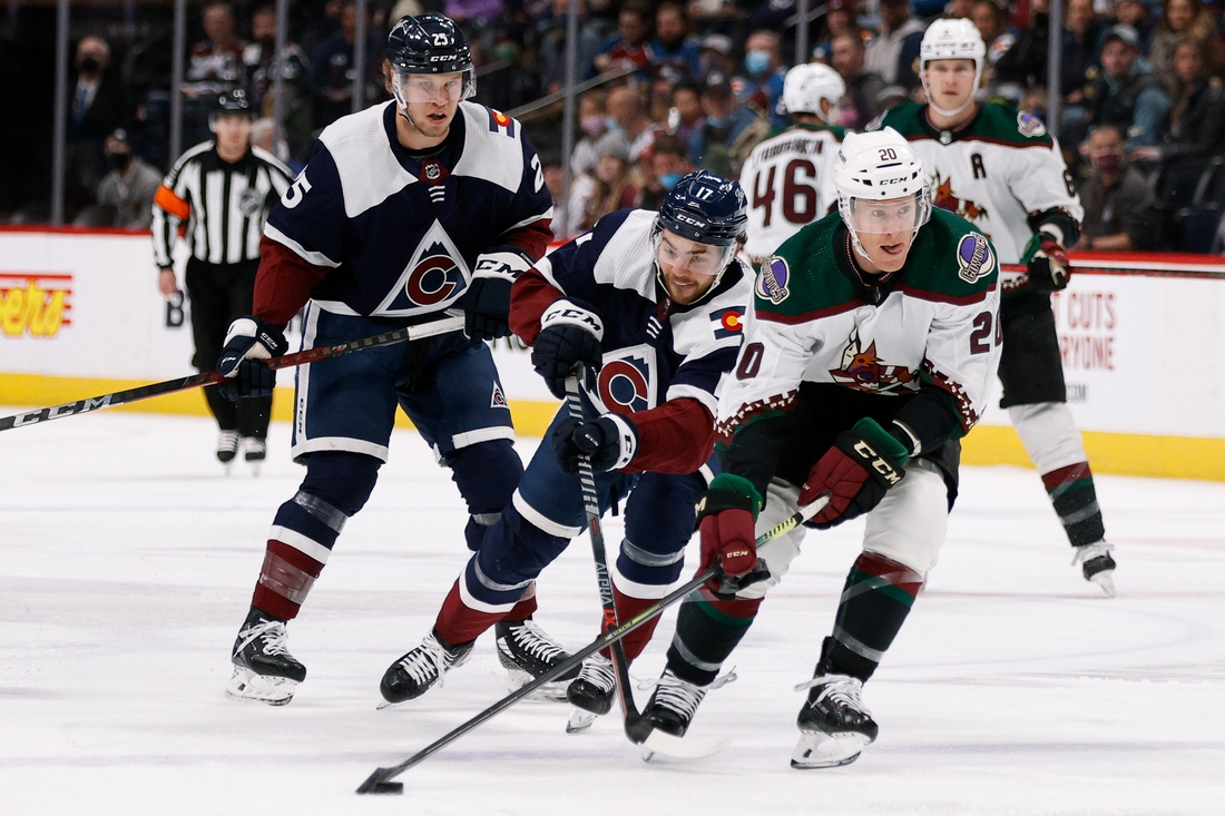 Despite the points disparity — Colorado has 52 more than Arizona — their games have been mostly competitive. Arizona is 1-1-1 in the three games, including a shootout win at Denver on Feb. 1 that ended the Avalanche’s 18-game home winning streak.
