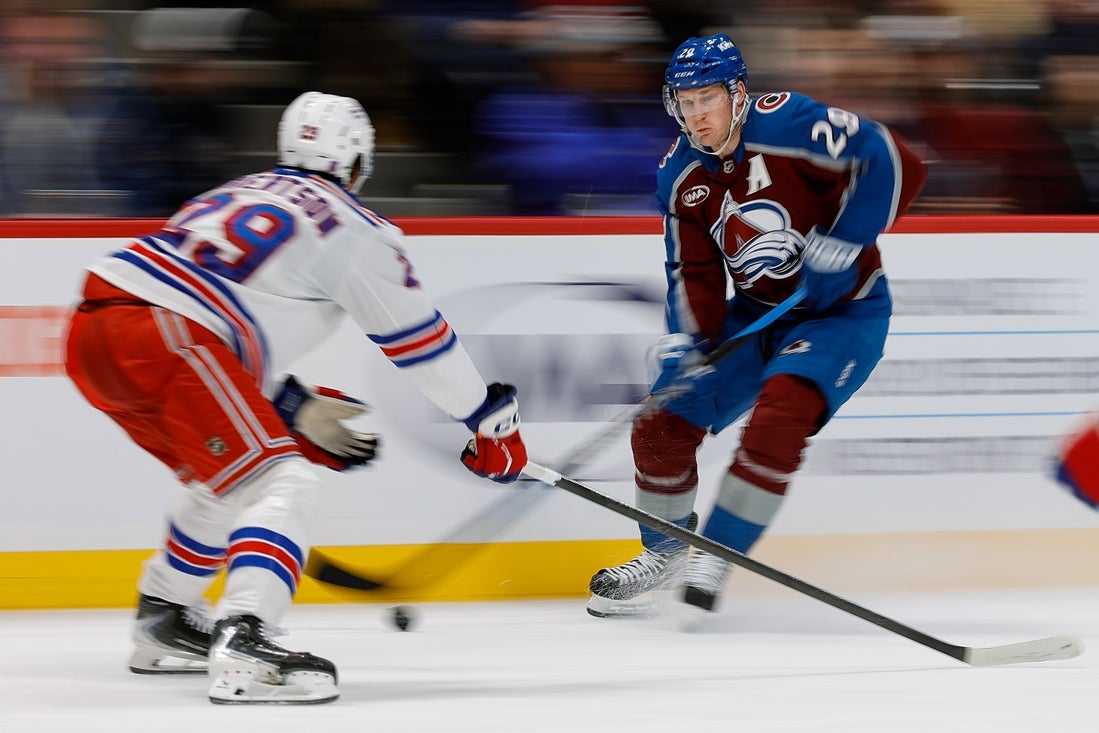 Colorado didn’t score on its two power-play chances but evened it in the final minute of the first period. Samuel Girard passed from the point to Necas in the left circle. Necas’ shot went off the skate of Rangers defenseman Vadislav Gavrikov to the right of Shesterkin, and MacKinnon knocked it in at 19:33.