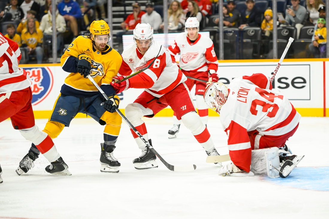 Tarasenko tied it with his second goal of the season. Jonatan Berggren fed him the puck from behind the Nashville net. Marco Kasper, called up from the American Hockey League’s Grand Rapids Griffins, was credited for the second assist and his first career point.