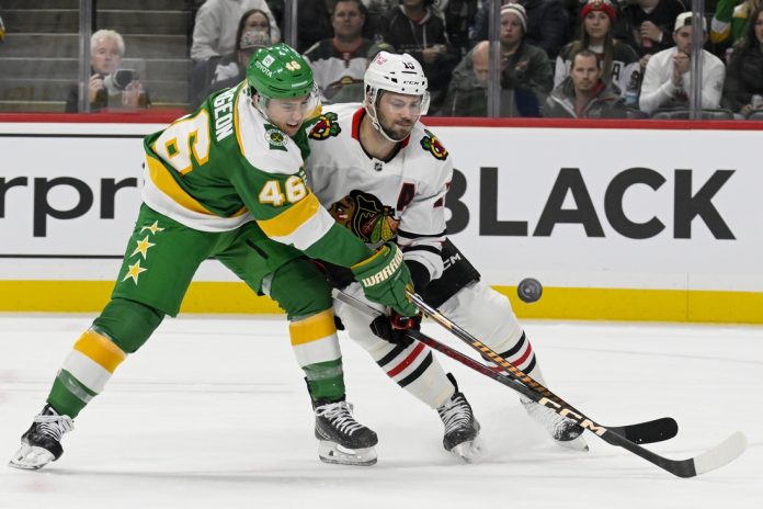 Marco Rossi cut Chicago’s lead in half after Marcus Johansson found him cutting to the net. Kirill Kaprizov, who played in his 300th NHL game, set up the goal with a spinning pass across the attacking zone to Johansson.