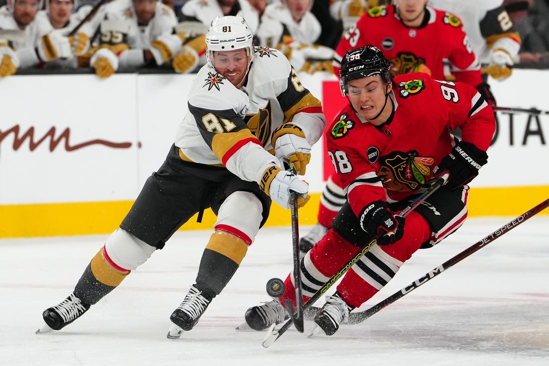 With William Karlsson in the box for tripping Connor Bedard, Kurashev intercepted a Vegas clearing pass inside the blue line. He skated in and fired a wrist shot through traffic and past the blocker of goalie Adin Hill for his first goal of the season.
