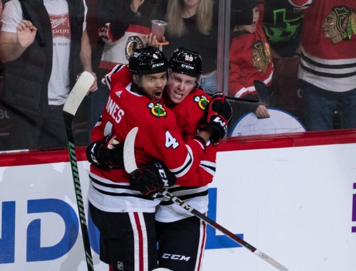 The Blackhawks went ahead 3-0 minutes later at 8:51, as Jones gathered a cross-ice feed from Ryan Donato and scored from the left circle.