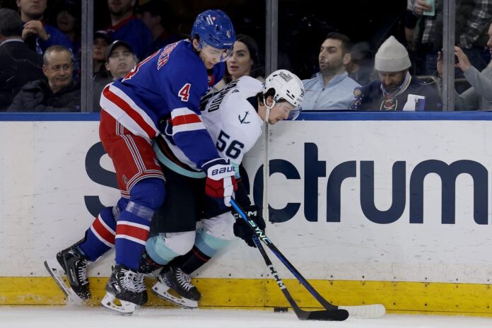 Seattle tied it a little over two minutes later, on a power play. Following Trocheck’s neutral-zone turnover, Eberle sent a shot from between the faceoff circles over Shesterkin.