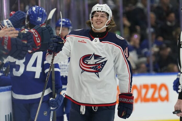Kent Johnson scored his second goal of the game 3:26 into overtime and the visiting Columbus Blue Jackets recovered from a third-period meltdown to defeat the Toronto Maple Leafs 6-5 Thursday night.