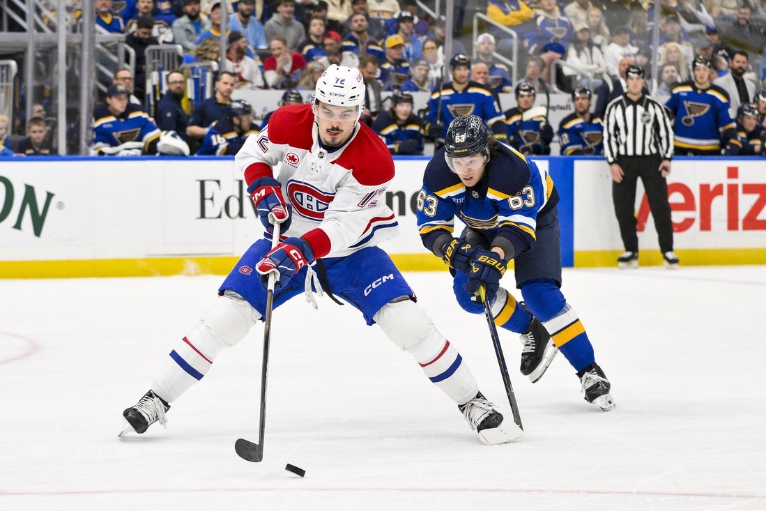 St. Louis finally broke through with 1:53 left in the period. Kyrou took a drop pass from Broberg, stickhandled into the slot and snapped a shot past Montembeault for his seventh goal in his last seven games.