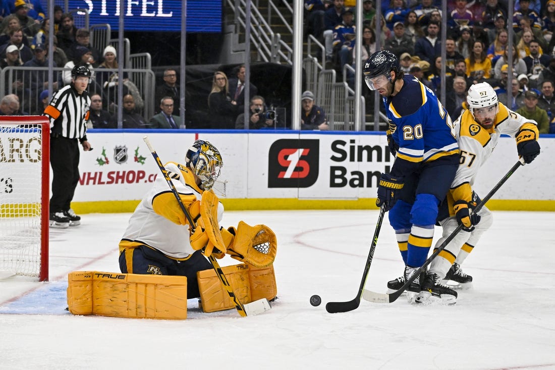 Nashville kept up the pressure, outshooting the Blues 9-4 in the second period overall, but they couldn’t break the scoreless tie.