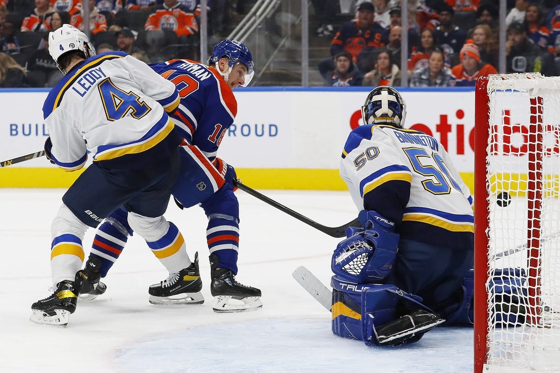 The Oilers outshot the Blue 10-5 in the second period and stepped up their pressure late. But Binnington made a left-arm save on Ryan Nugent-Hopkins to keep the Blues up 1-0.