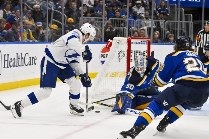 Tampa Bay held the Blues without a shot for the first nine minutes of the game and outshot them 9-3 in the scoreless first period.
