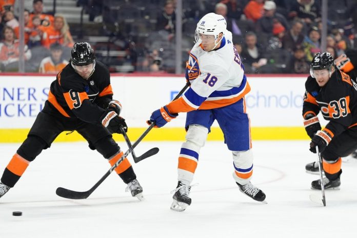 The Islanders tied it with just over a minute left in regulation, as Horvat’s shot from the top of the right circle ricocheted off the stick of Flyers defenseman Travis Sanheim and into the net.