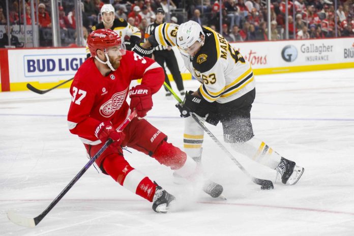 Marchand was called for hooking with 1:22 left. The Red Wings couldn’t tie it as Moritz Seider hit the crossbar with 30 seconds left and Swayman covered up.