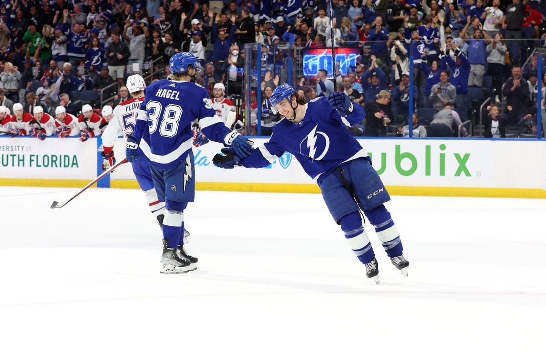 Playing in his 200th NHL game, Brandon Hagel capped his hat trick by scoring twice in the third period to pace the Lightning to a 5-3 victory over the Montreal Canadiens on Saturday.