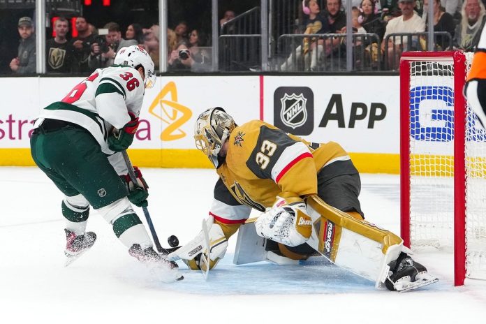 Minnesota tied it just 13 seconds later on a power-play goal by Kaprizov, who one-timed a pass from Mats Zuccarello from the bottom of the right circle five-hole on Hill. It was Kaprizov’s 15th career playoff goal, one behind Zach Parise’s team record of 16, and his fifth of the series.