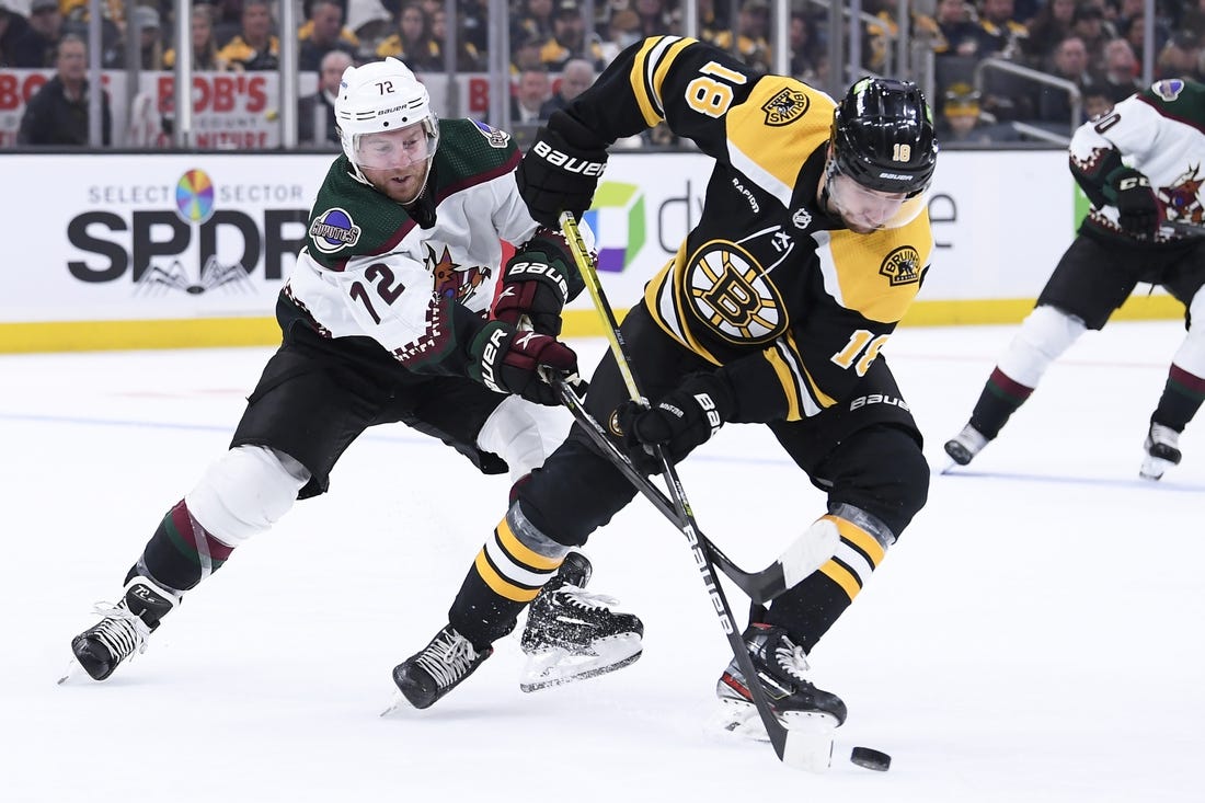 A.J. Greer logged two goals and an assist while Derek Forbort scored the go-ahead goal to lift the Boston Bruins to a 6-3 win over the visiting Arizona Coyotes on Saturday night.