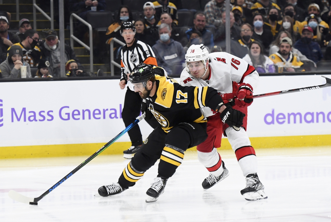 After a tight first period, Carolina pulled away with three goals in the second. Boston was 0-for-4 on the power play in the loss.