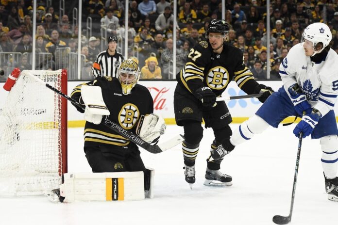 Pastrnak raced up the right wing and scored off the carom of defenseman Hampus Lindholm’s lob off the corner boards, tucking a backhander between the left post and the skate of Toronto goaltender Ilya Samsonov (29 saves).