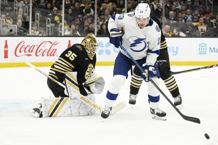 The incident occurred during Tampa Bay’s 3-2 shootout win Tuesday night in Boston.