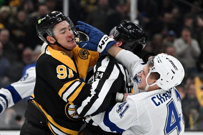 Boston made five trades before Friday’s deadline, including shipping off fan favorites Marchand (to the Florida Panthers) and Charlie Coyle (Colorado Avalanche), but took the play to the Lightning with its new-look lineup.