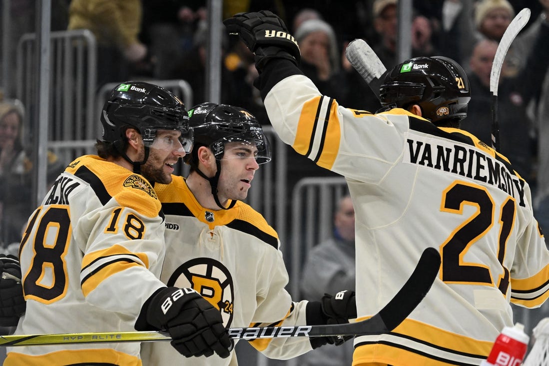 David Pastrnak, Brad Marchand, Charlie Coyle and Jake DeBrusk each added a goal and an assist, while Brandon Carlo and Pavel Zacha also lit the lamp.