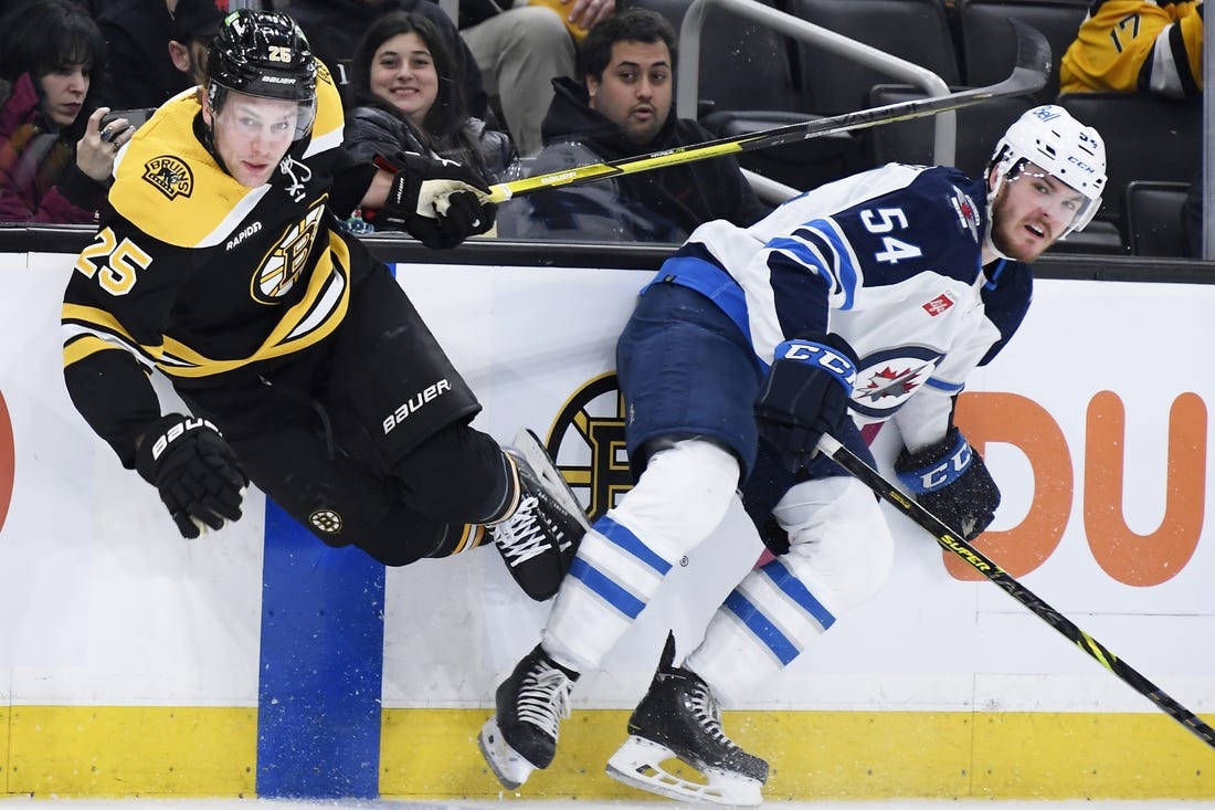 Harkins tipped home a Josh Morrissey point shot through Swayman’s five-hole, doubling the Winnipeg lead at the 7:20 mark.
