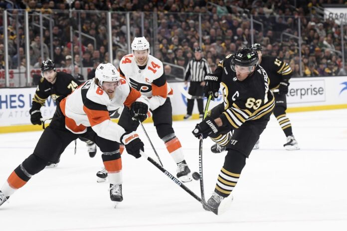 Charlie Coyle scored his second goal of the game to launch the Boston Bruins’ four-goal third period as they held off the visiting Philadelphia Flyers for a 6-5 win on Saturday night.