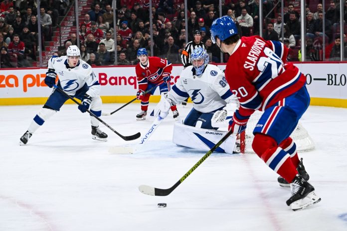 The Lightning, who lost 5-3 in Toronto the night before, grabbed the first goal when Montreal’s Kaiden Guhle got turned around on an entry flip. Kucherov found the bobbling puck and jammed it past Montembeault at 14:20 of the first period to extend his streak.