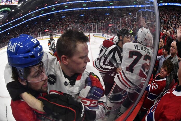 Montreal center Kirby Dach left the game with a lower-body injury in the first period after a hard check by Jarred Tinordi sent him into the Chicago bench.