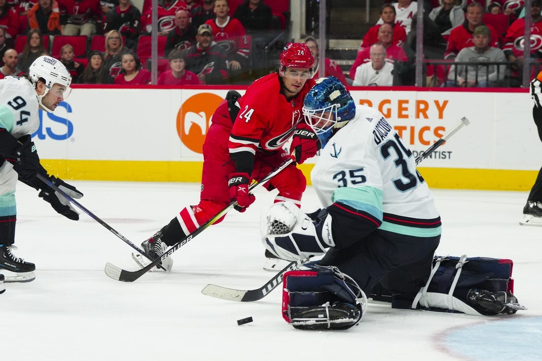 Necas put the Hurricanes on the board with 1:38 to play in the first following a couple of Kraken blunders while trying to get the puck out from behind the net.