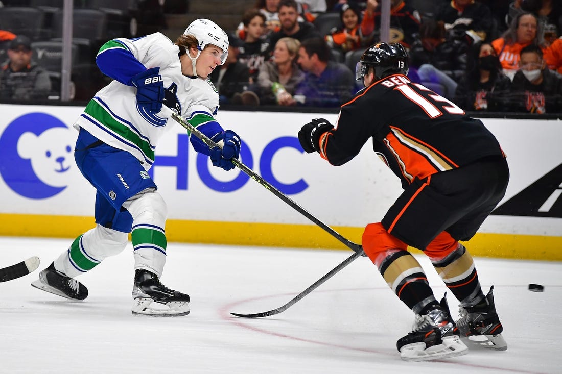 Elias Pettersson scored his career high 33rd goal of the season as the visiting Vancouver Canucks beat the Anaheim Ducks 2-1 on Sunday to take both games of a two-game California swing.