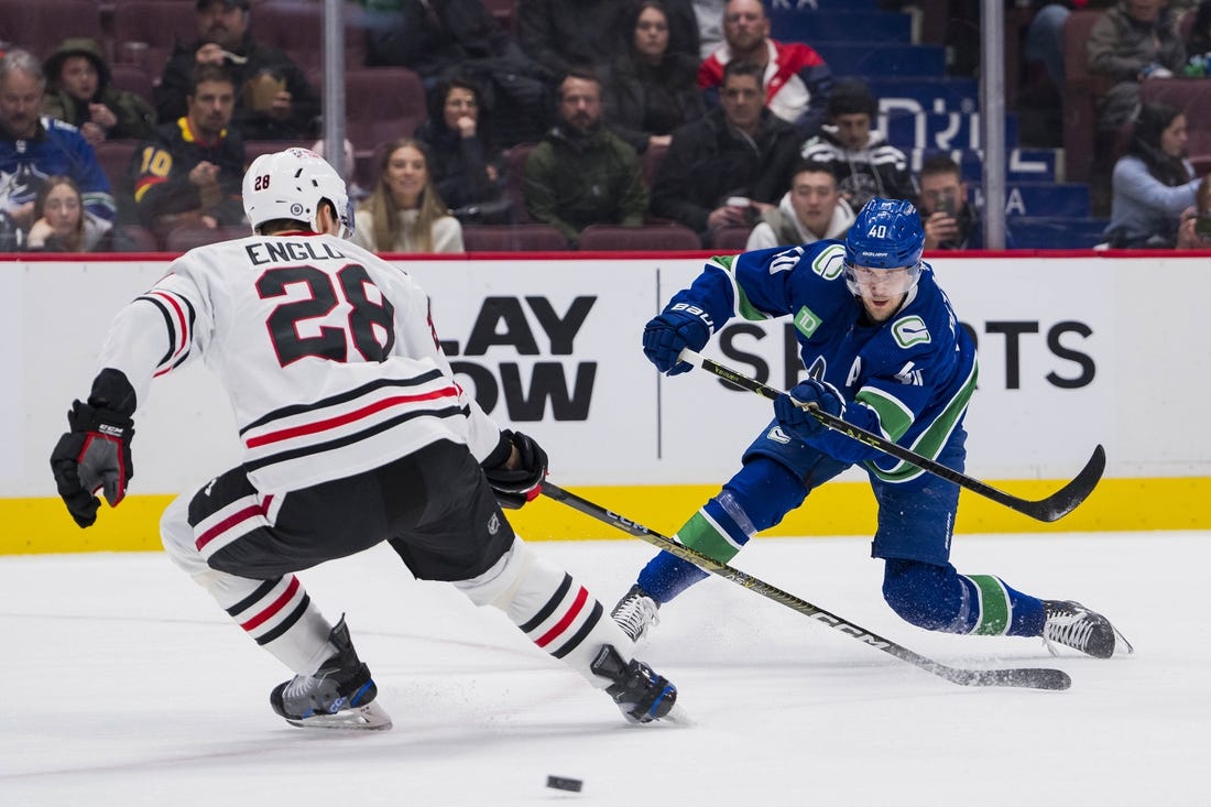 One of Demko’s best saves of the game came halfway through the first period when he stuck out his left leg pad and robbed Boris Katchouk from in close on a Blackhawks’ power play. He also stopped speedy forward Lukas Reichel on a breakaway in the second.