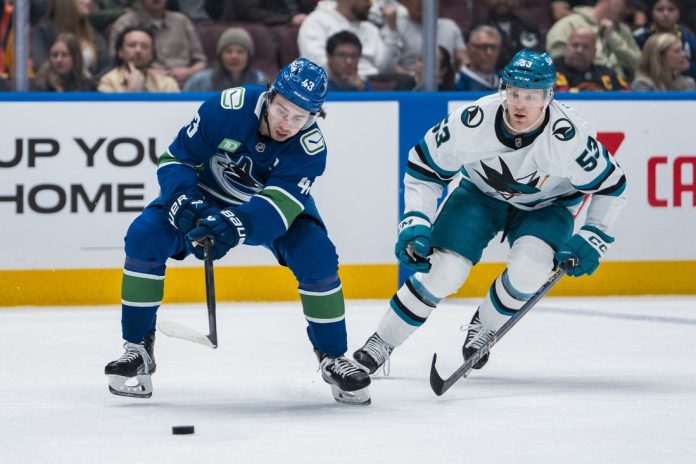 Linus Karlsson also scored a goal and Nikita Tolopilo made 15 saves in his NHL debut for Vancouver (38-29-14, 90 points), which extended its home win streak against the Sharks to nine games.