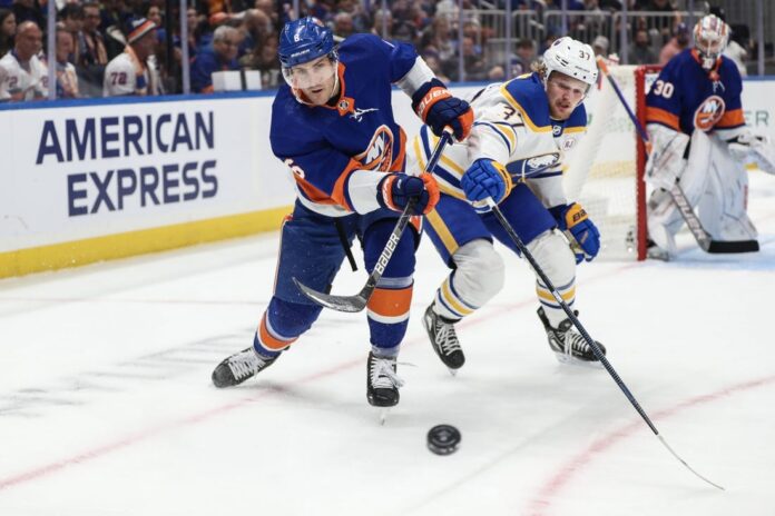 The Sabres took advantage of a bouncing puck to tie the score 2:34 into the third. Rasmus Dahlin, stationed just in front of the blue line, fired a puck off the boards and it glanced off Benson, who was surrounded by Dobson and Matt Martin. But neither Islanders player could gain possession and Mittelstadt picked up the puck, shuffled a couple of beats and then fired a no-look backhander beyond Sorokin’s glove.