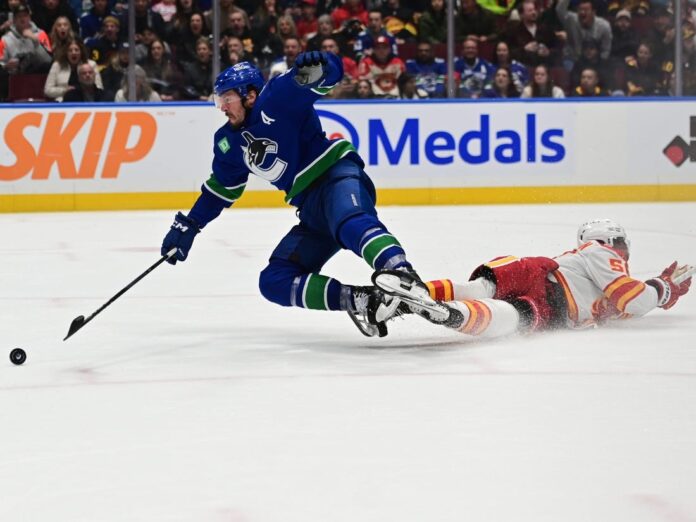 Hoglander opened the scoring only 48 seconds in by redirecting a pass into the net and then added his second on a breakaway, freezing the Calgary goalie Jacob Markstrom with a kick-fake before lifting a backhand high under the crossbar.