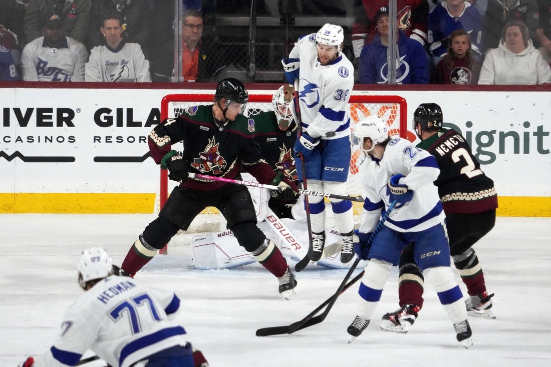 After earning the match’s first power play and outshooting the home side 13-2 through almost 10 minutes, Tampa Bay went on a second power play when Arizona’s Troy Stecher went off for delay of game at 11:46.