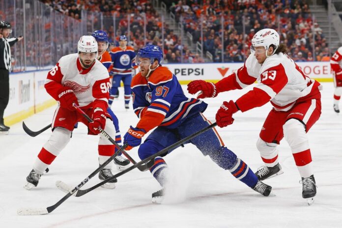 Connor McDavid dished out a career-high six assists and Ryan Nugent-Hopkins had two goals and a helper as the Edmonton Oilers downed the visiting Detroit Red Wings 8-4 on Tuesday night.