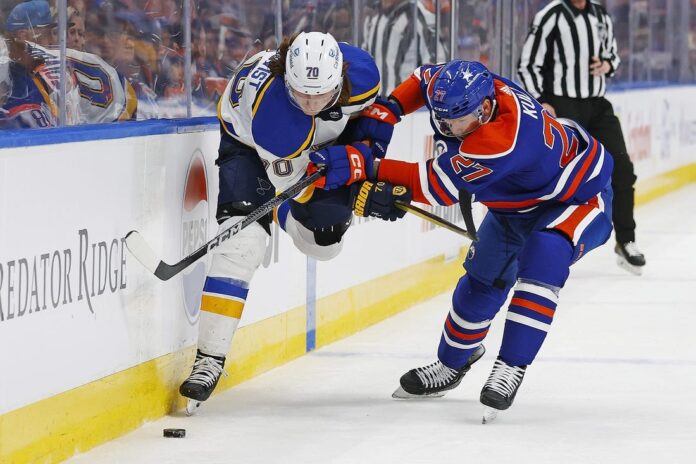 The Oilers caught the Blues on a bad player change to tie the score 2-2 at the 4:54 mark of the second period. Evan Bouchard connected with McDavid on a long outlet pass to create a 2-on-0 break, then Hyman scored his 40th goal of the season off McDavid’s centering pass.