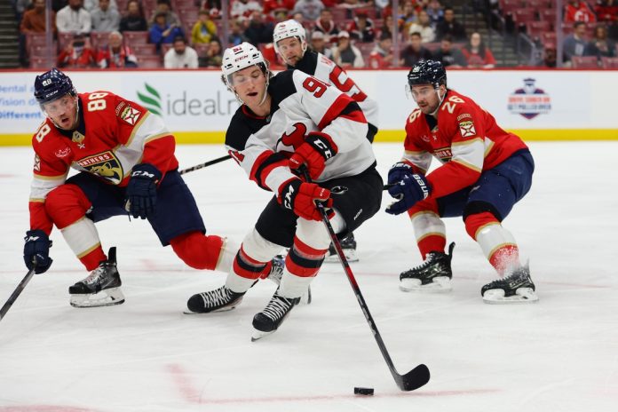 Jesper Bratt recorded his second career hat trick and Stefan Noesen scored two goals, lifting the New Jersey Devils to a 6-2 victory over the Florida Panthers on Thursday in Sunrise, Fla.